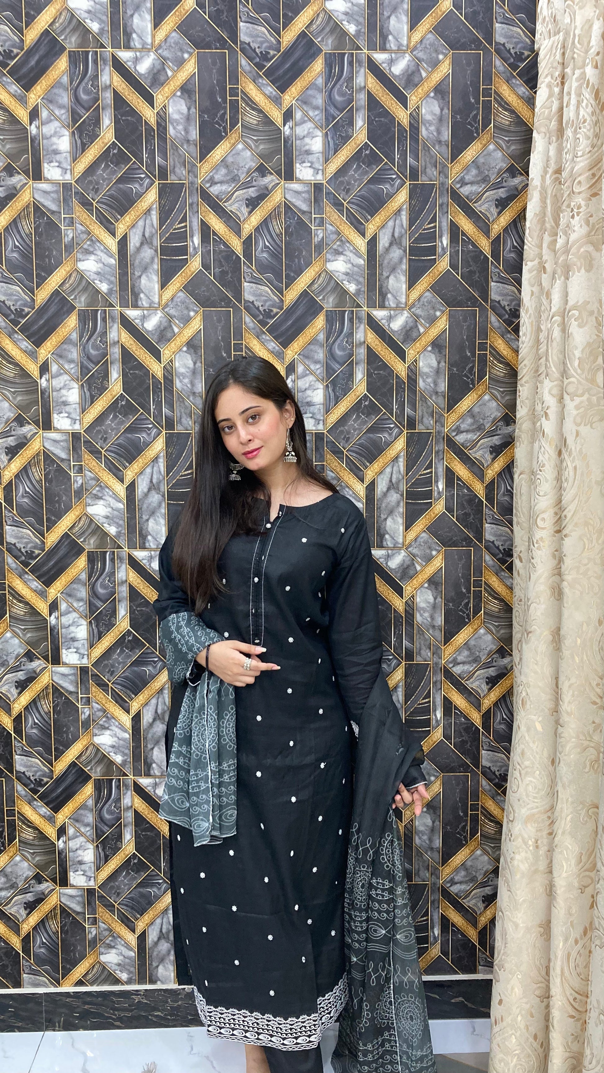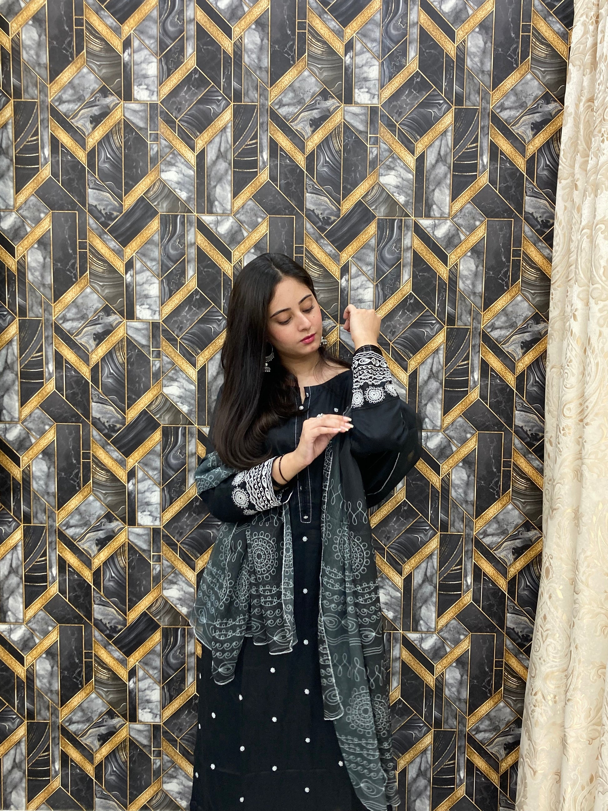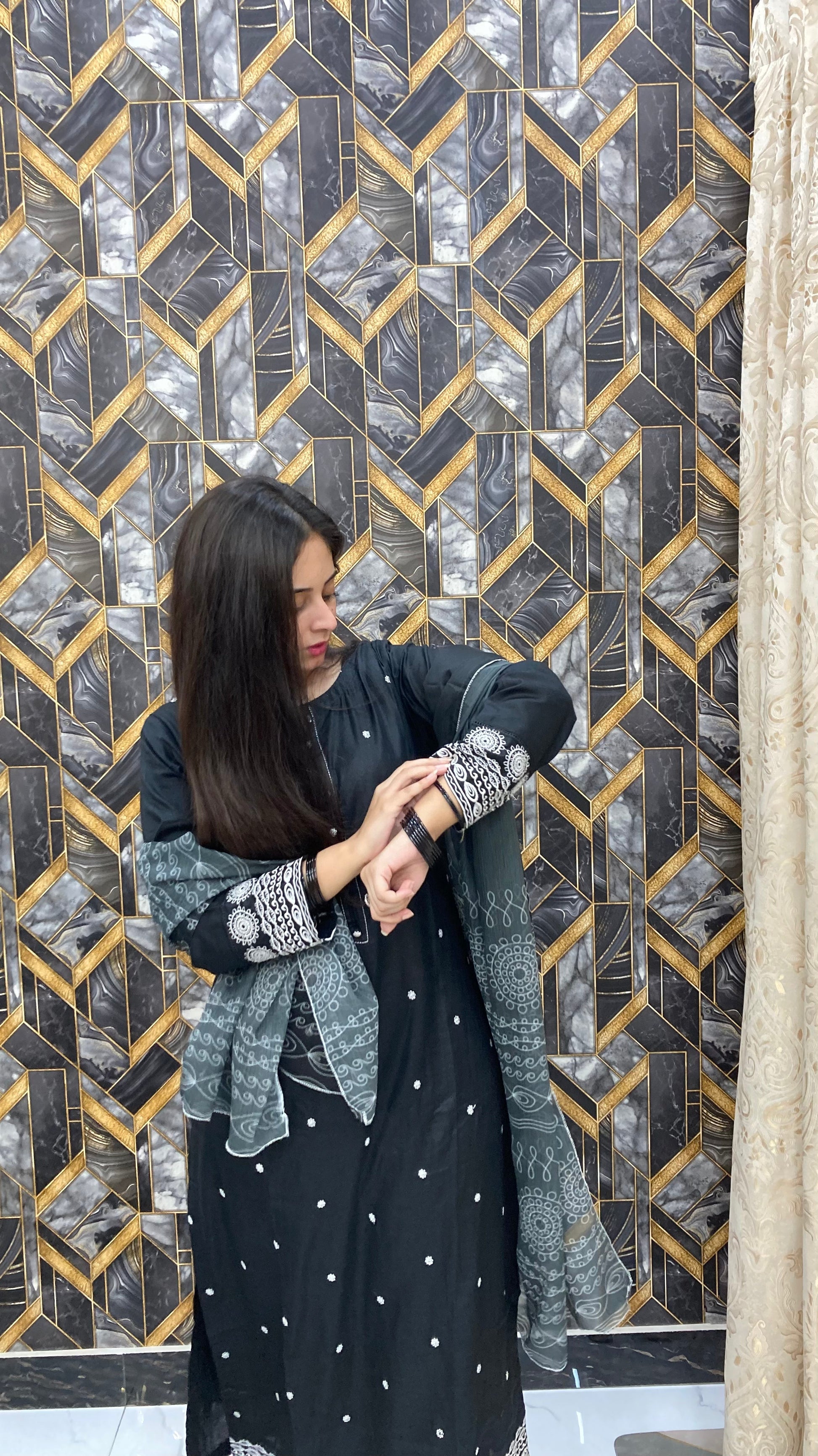 Elevate your wardrobe with our exquisite 3-piece lawn fabric set, featuring a sophisticated black base adorned with delicate white embroidery. This set includes: